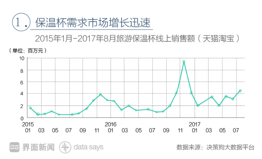 其实,在这次事件之前,保温杯就已走上“逆袭”之路。来自天猫和淘宝的数据显示,保温杯的线上销量在近年上升很快,2017年夏季的旅游保温杯销量甚至超过了2015年冬季。有业内人士指出,准确地说,中年人是保温杯的传统市场,追求品质和时尚的年轻人则是各保温杯品牌如今主攻的市场方向。一个有力的证据是,在8月23日保温杯话题爆火后,天猫平台关于“保温杯”的搜索指数飙升,其中30岁以下的消费者比重达63%,女性消费者也占到62.55%。