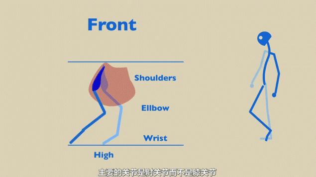 动物的身体前部是用双臂在行走,主要的关节是肘关节。在脚部接触地面后,身体继续向下;在步伐交换后,身体向上轻微移动。