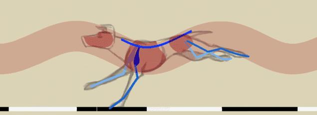 当后肢接触地面时,狗的身长最短,弯曲的身体变成储存能量的弹簧。