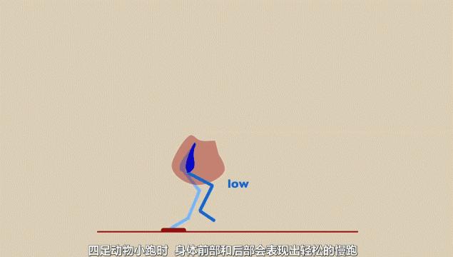 四足动物小跑时,身体前部和后部会表现出轻松的慢跑。当身体达到高点时,只有一只脚在地上。过渡位成为身体的最低点。