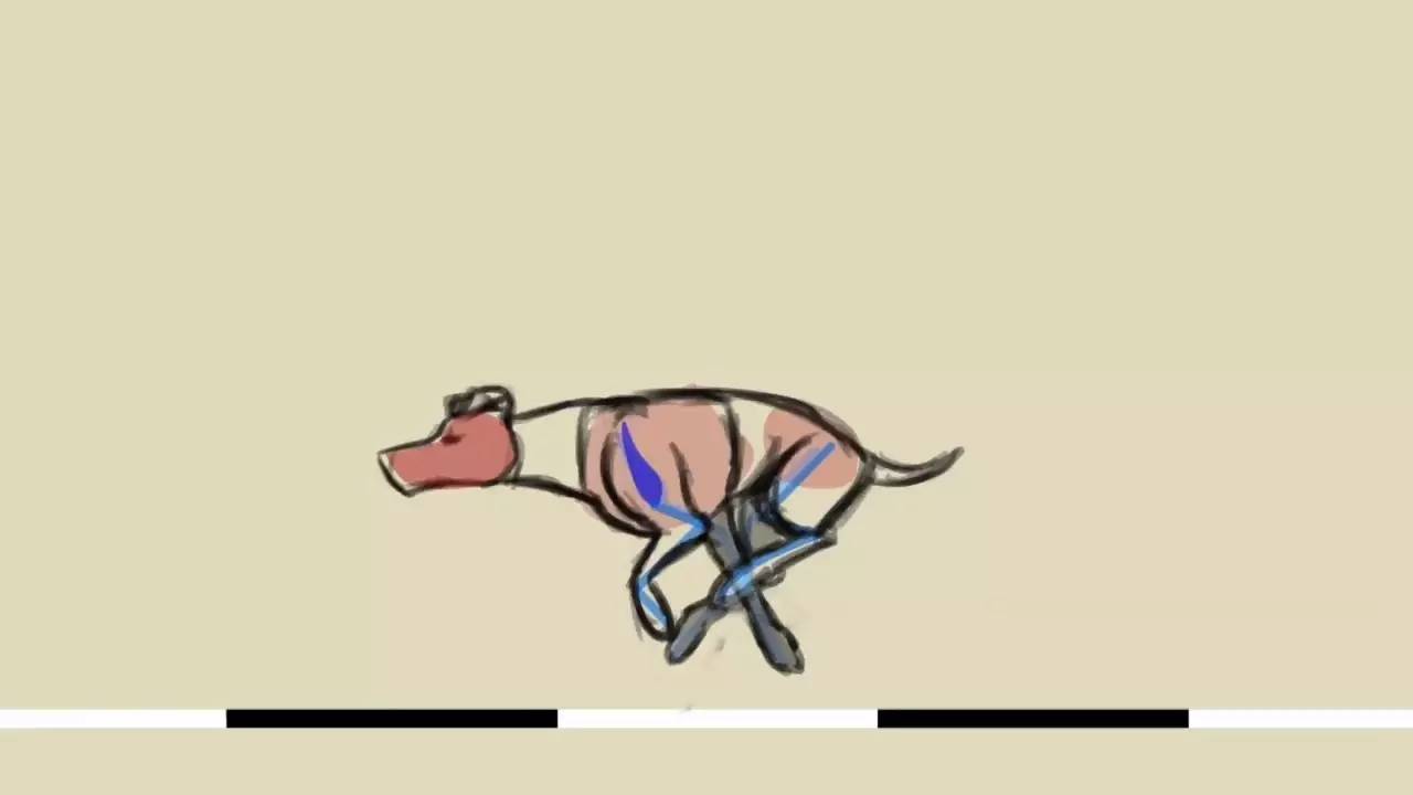 狗的脚在地上的时候是静止的,但是动物体内传递的力量需要比动物移动得更快,以使四肢追上并超过身体,以便准备下一次推力。