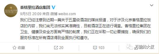 香格里拉酒店是第二个回应此事的酒店,但却是第一个在微博上公开回应此事的。9月5日20点09分,香格里拉酒店在其官方微博上强调“尚无法核实其准确性,目前酒店正在调查”之后,就没了下文。