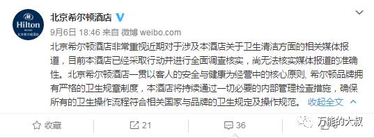 9月6日18点46分,整整晚了近24小时,北京希尔顿酒店也在其官方微博上几乎用了一模一样的口径,称“尚无法核实媒体报道的准确性”之后,也继续没了下文。