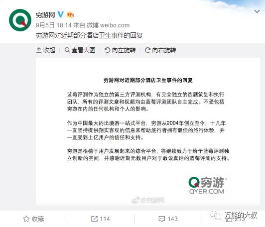 9月5日晚上,一些媒体和网友开始将“矛头”指向了蓝莓评测,称其背后的“黑手”是穷游网,后者作为旅游类社区,与酒店有个千丝万缕的关系。