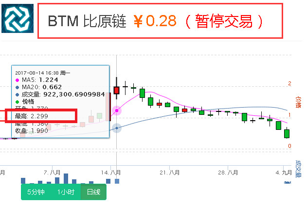 比原链价格在8月14日的最高价格达2.299元,随后一路震荡大幅下跌。在央行等七部委严厉叫停ICO之后,比原链价格暴跌到了0.28元,这意味着8月14日高点购买的投资者已经最高巨亏88%。