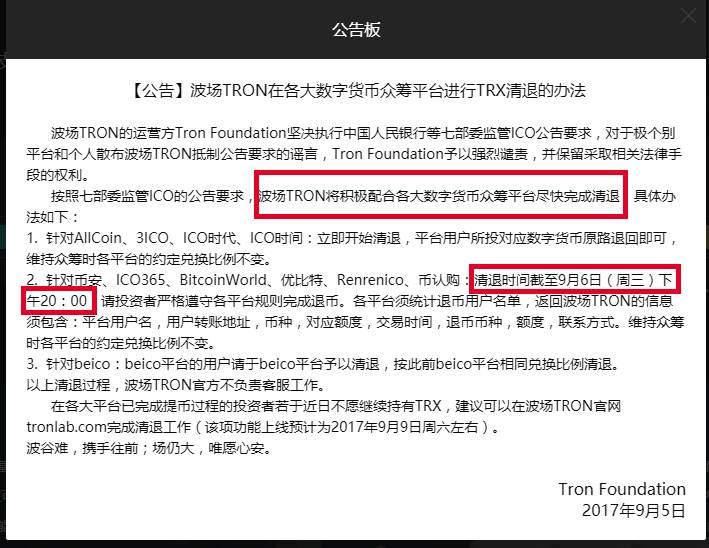 波场TRON已经于2017年9月5日公告称,清退了数字货币。