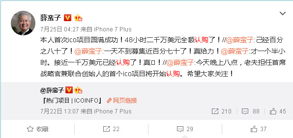 2017年7月22日,薛蛮子在其微博上公开募资其担任首席战略官兼联合创始人的Bex基金。经过48小时,2000万美元被全额认购。