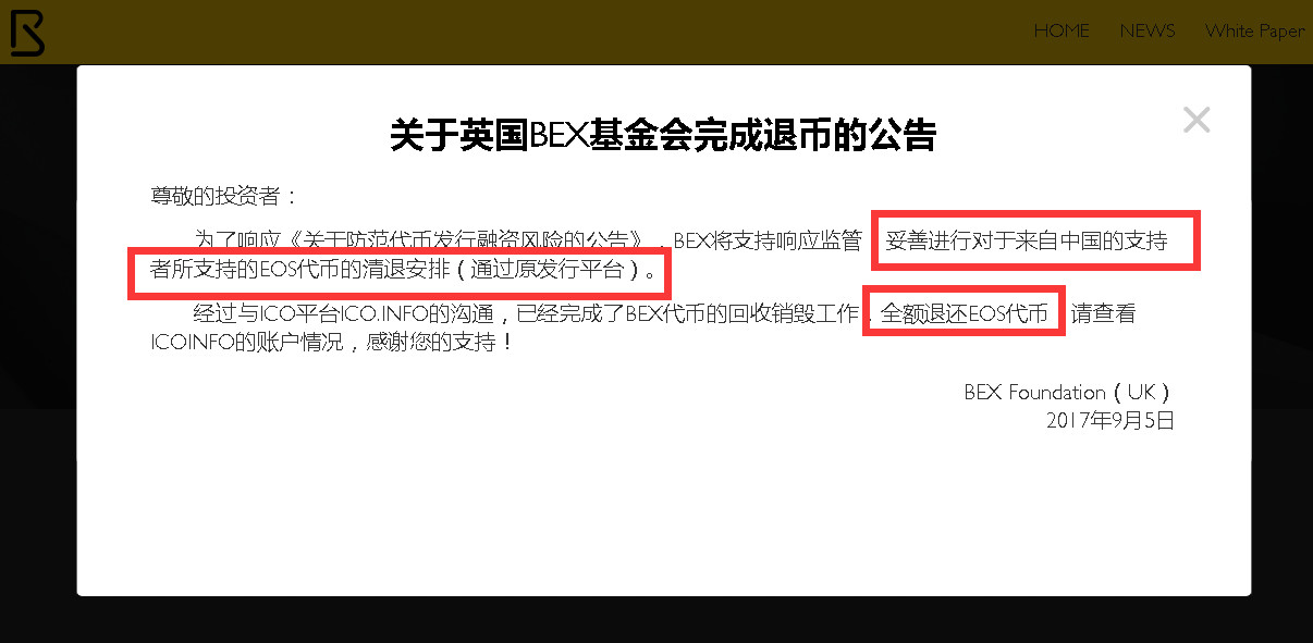 而在9月4日央行将ICO定性违法金融犯罪后,薛蛮子也在微博上声明已经和他作为天使投资人投资的融资主体在海外ICO项目取得联系,而位于英国的BEX基金也已经发布通知表示将会退还来自中国支持者的全部支持代币(即跌幅过半的EOS)。