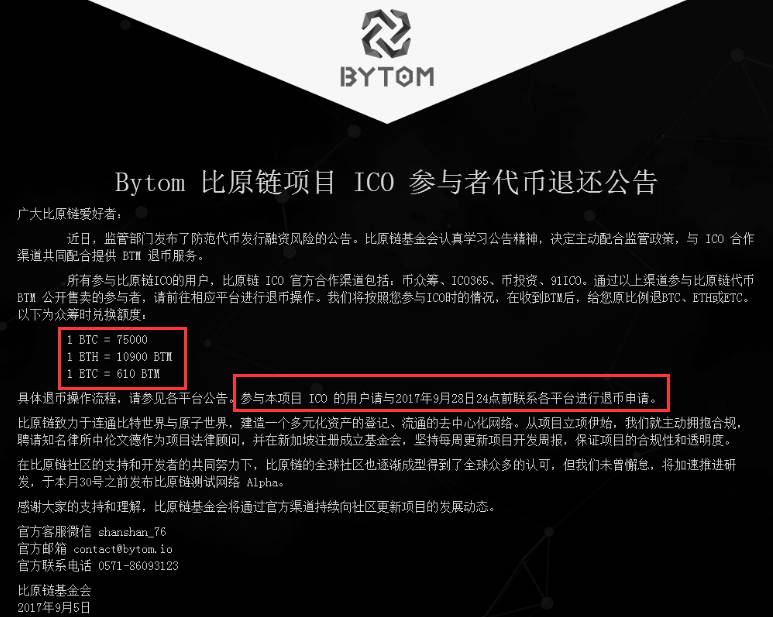 比原链公告显示,近日,监管部门发布了防范代币发行融资风险的公告。比原链基金会认真学习公告精神,决定主动配合监管政策,与 ICO 合作渠道共同配合提供 BTM 退币服务。