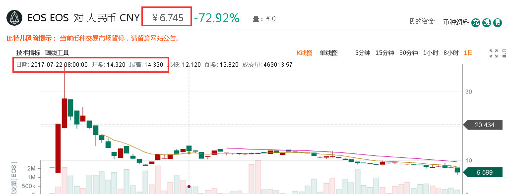 从EOS的交易价格走势来看,7月22日交易价格为14.32元,在9月4日停止交易之前,价格已经暴跌到了6.745元,短短一个半月左右的时间,按EOS价钱计算已经巨亏过半。