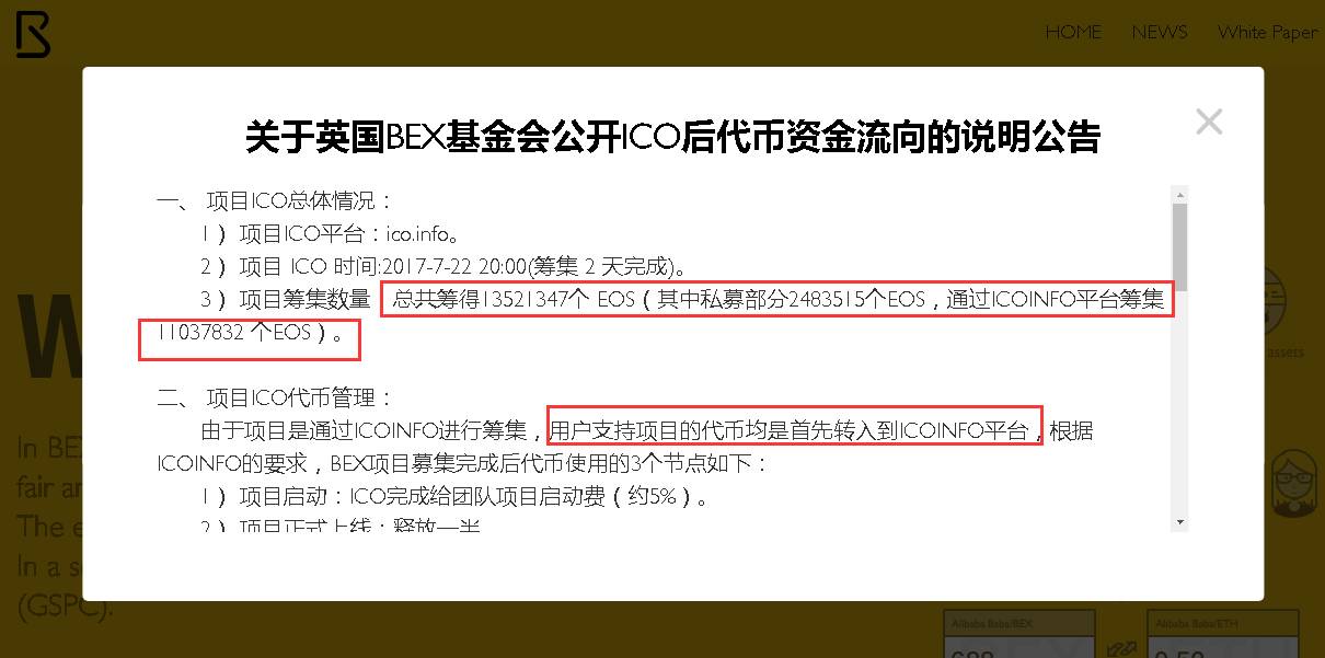 据当时参与认购的投资者截图,该项目介绍开始募资两天前,将分红权益比例从原定的10%增加至40%,EOS作为唯一的众筹币,ICO时间 2017年7月22日到29日,1EOS=7.2478 Bex,每人限额5519 EOS。