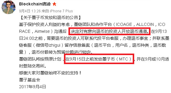 薛蛮子通过微博募集2000万美元资金的另一个项目是墨链,这一项目在9月4日央行等部门宣布叫停ICO之后,也发布了退币公告。