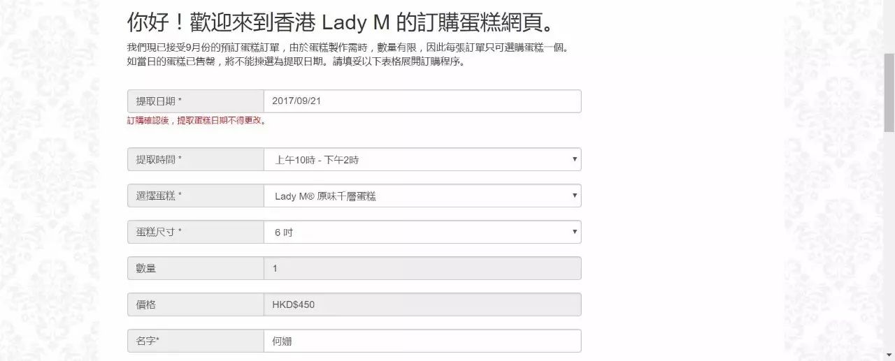我在 9 月 7 号打开 Lady M 的香港页面,目前最早可以预定 21 号的原味千层蛋糕