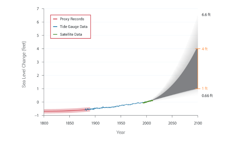 全球海平面的上升速度不断增加。比如在美国东海岸,海平面上升的速度比全球平均水平还要快三到四倍。1993年,海平面上升的平均速度是每年2.2毫米,2014年,这个速度达到了每年3.3毫米。到2100年时,全球平均海平面将上升2米到2.7米。根据美国联邦政府资助的“国家气候评估”(National Climate Assessment)小组所发布的数据,自1990年以来,美国东海岸的海平面已经上升了0.3米左右。