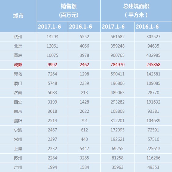2017年1-6月龙湖地产各城市合同銷售額明細销售额明细(前15名)