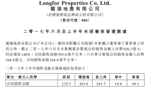 8月16日,龙湖地产发布2017半年报,数据显示,龙湖上半年合同销售额达926.3亿元,较上年同期增长140.0%。销售总建筑面积595万平方米,较上年同期增长132.7%。销售单价为人民币15567元/㎡,同比增长3.2%。分片区来看,销售额排前面的主要是环渤海、长三角以及西部地区,分别占集团合同销售额的32.7%、30.4%、25.1%。
