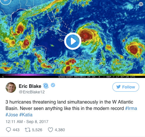 而美国国家气象中心的飓风专家布莱克(Eric Blake)则指出,这是现代历史上第一次出现三大飓风以最危险的方式在大西洋上排排站。