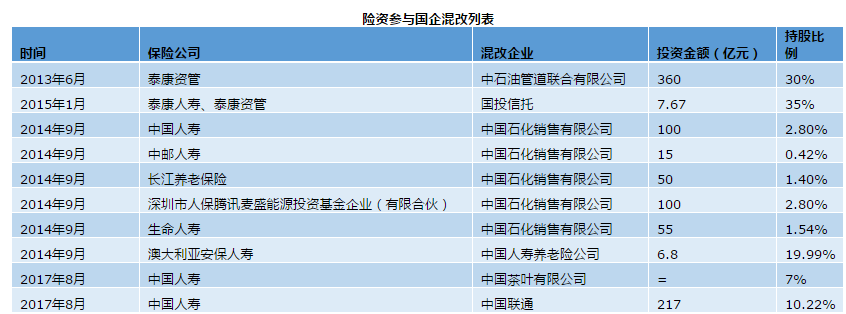 近年险资参与国企混改可以追溯到2013年6月,泰康资管出资360亿元与中石油及国联基金合资建立中石油管道联合有限公司,参与“西气东输”项目。这是近年险资参与混改出资最大的项目,持股比例达到30%。