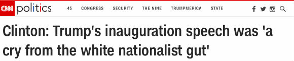 “我是前第一夫人,很多前总统和第一夫人都露面了,”克林顿说,“这展现了我们政府的延续性,我在站台上,感觉像是灵魂出窍。然后是他的演说,那是白人民族主义者的呐喊。他非常成功地用恋旧情结给数百万烦恼于他人成就的人带来希望和安慰,缓和他们的委屈——数百万白人。”
