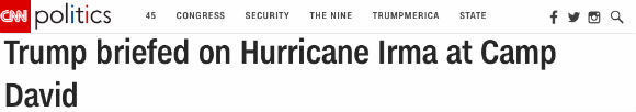 【特朗普坐镇戴维营听取飓风艾尔玛简报】美国总统特朗普近几周来迎来了他作为总统的第二场飓风。周日,他听取了飓风艾尔玛袭击佛罗里达州的简报。