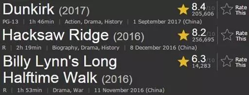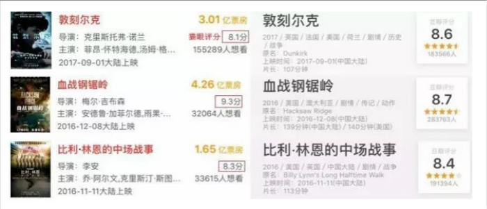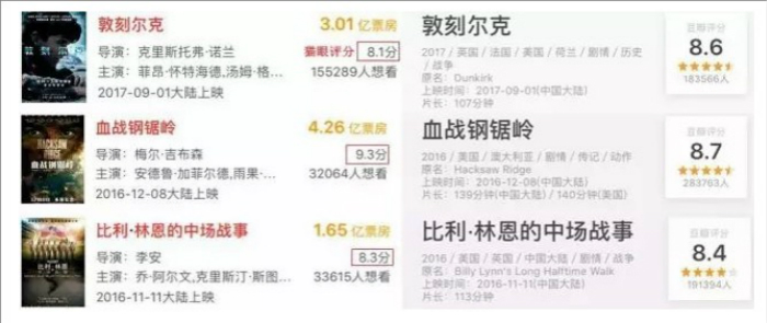 在中国,豆瓣评分《血战钢锯岭》8.7,《敦刻尔克》8.6,《比利-林恩的中场战事》8.4,基本相当,都属于佳作。猫眼观众评分《血战钢锯岭》9.3分,遥遥领先,《比利-林恩的中场战事》8.3分,《敦刻尔克》8.1分,垫底。