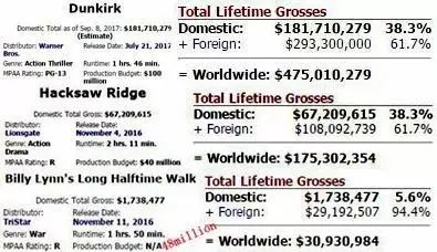 在北美,《敦刻尔克》票房1.82亿美元,《血战钢锯岭》6721万美元,《比利-林恩的中场战事》174万美元。全球范围内,《敦刻尔克》票房4.75亿美元,《血战钢锯岭》1.75亿美元,《比利-林恩的中场战事》3093万美元。