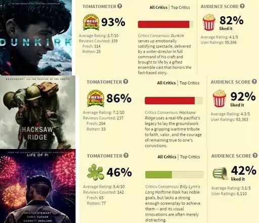 再回到口碑。在北美,不管是媒体评分还是大众评分,都是《敦刻尔克》>《血战钢锯岭》>《比利-林恩的中场战事》。烂番茄新鲜度《敦刻尔克》93%,媒体平均分8.7;《血战钢锯岭》86%,媒体平均分7.2;《比利-林恩的中场战事》46%,媒体平均分5.4。