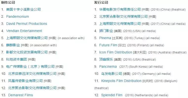 当然,这部电影跟主流好莱坞系统没多大关系,只有4000万美元的成本,来自中国的上海熙颐文化、澳洲的宇宙电影娱乐、美国的十字小溪影业等十几家公司,全是独立的小公司。北美发行是狮门在负责,这也是一家好莱坞六大以外的独立公司。