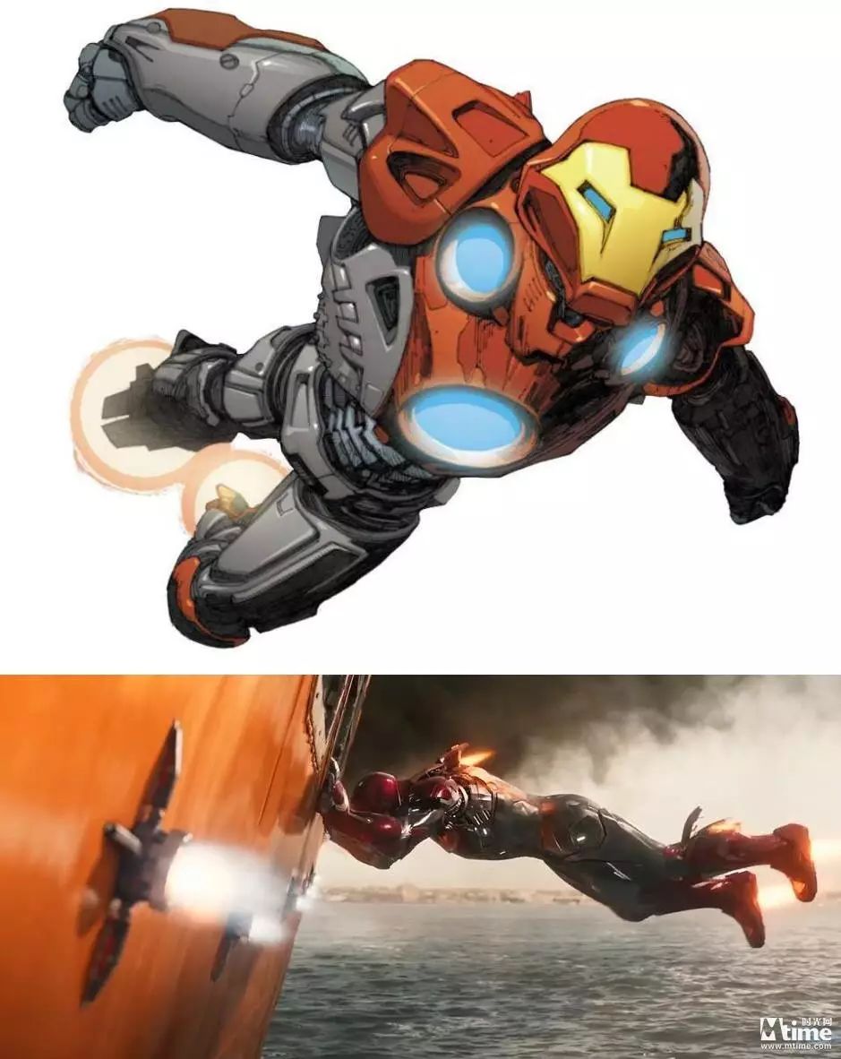 除了前文提到的好基友内德,《英雄归来》中的许多角色与设定都是以“终极宇宙“为蓝本进行改编的。最直观的体现便是钢铁侠,虽说在本片中戏份不多,但新配色的MK47战甲非常抢眼,其设计原型毫无疑问参考了”终极钢铁侠“战甲。