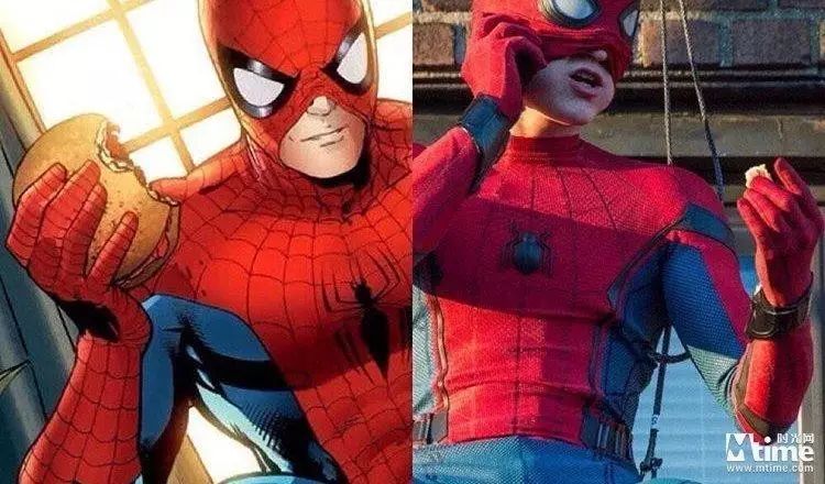 小蜘蛛在忙了一天后,坐在逃生楼梯的栏杆上吃三明治,而他掀起面具露出半张脸的造型在漫画中比比皆是,吃饭,喝水,接吻,但凡需要动嘴的时候小蜘蛛都会掀起面具。