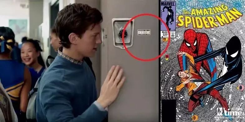 在片中,小蜘蛛的储物柜号码是1184,84的年份对上了,11有可能指的是11月的258话,小蜘蛛在神奇四侠的帮助下和毒液战衣说再见,这个彩蛋也算是对前期期待毒液大战小蜘蛛的漫迷的补偿吧。