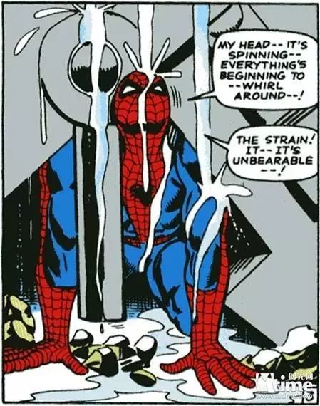 而彼得举起钢筋的造型,以及这个仪式化的桥段都致敬了66年《神奇蜘蛛侠》第33话的封面与故事:在上一话大战章鱼博士后,小蜘蛛被压在了数吨重的钢筋下动弹不得,最后他还是凭借毅力成功脱困。