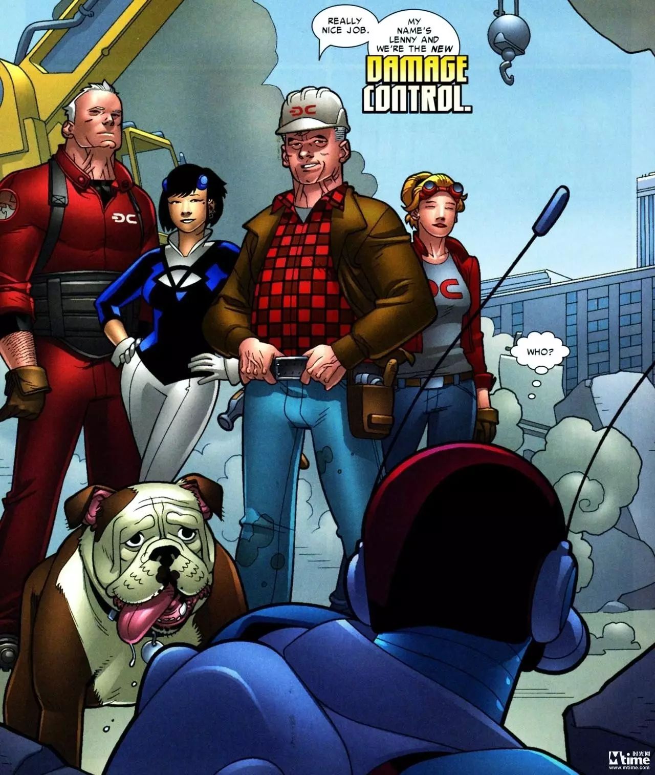 漫画中这支队伍成立于1989年,并不听命于斯塔克。损害控制局最开始是给超胆侠这种街头级别的英雄收拾烂摊子,后来生意越做越大,和毁灭博士、神奇四侠、神盾局、复仇者联盟都签过承包合同。他们甚至在2006年《内战》大事件中扮演战争商人,扩大灾害规模大发国难财。
