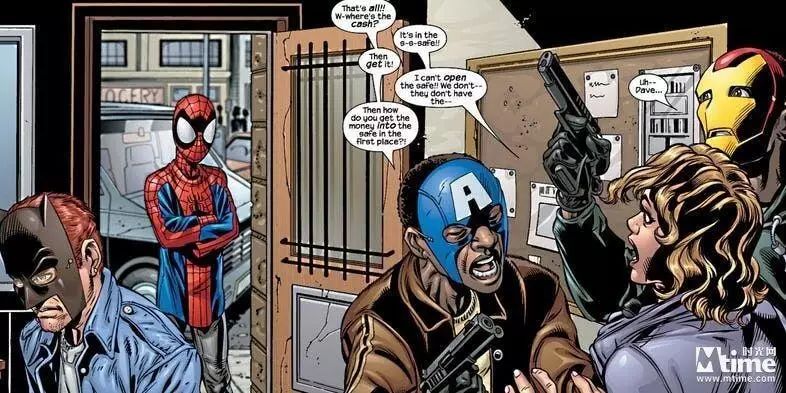 影片中蜘蛛侠大战“复联“的桥段,事实上也出自《终极蜘蛛侠V1》。在V1第42话中,就有几个街头混混戴上了钢铁侠和美国队长的面具,抢劫街对面的现金兑换铺,电影和漫画中的大战都以一场爆炸结束,只不过漫画中有一个戴着蝙蝠侠面具的劫匪最为抢眼….