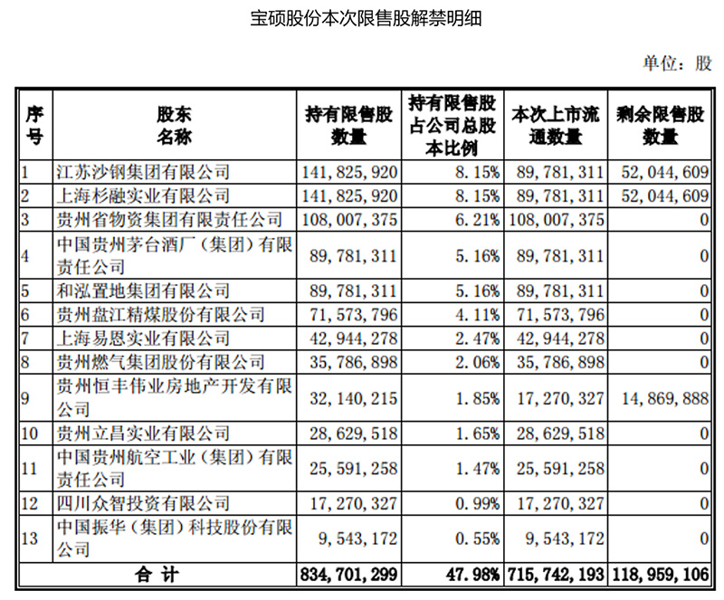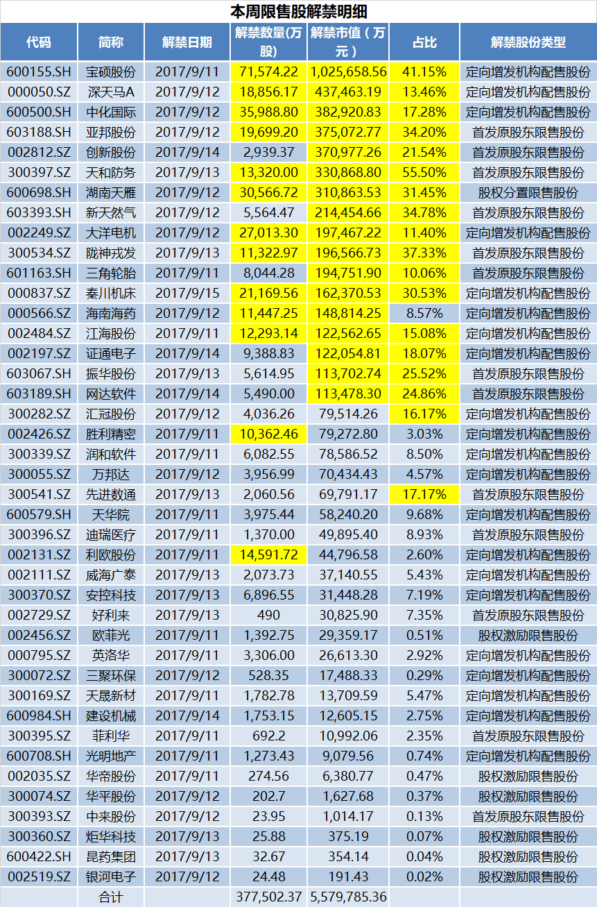 宝硕股份公告显示,9月11日公司有7.16亿股非公开发行限售股上市流通,占总股本比例约41%。公司一年前定增发行7.15亿股购买华创证券95.01%股权。本次限售股上市涉及股东有13位,包括江苏沙钢集团、上海杉融实业、贵州省物资集团、中国贵州茅台酒厂(集团)有限责任公司等。