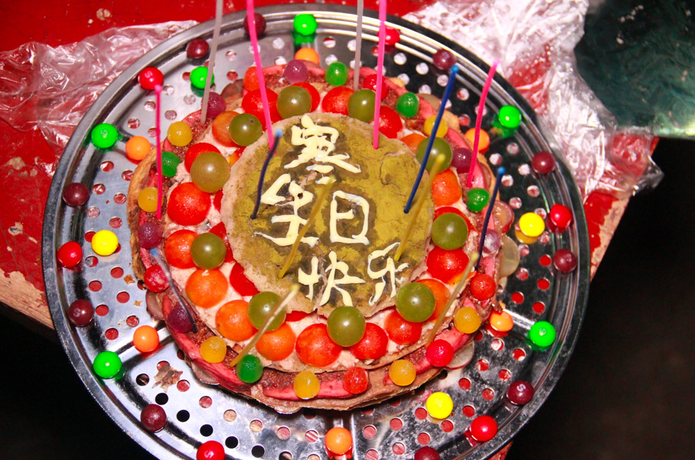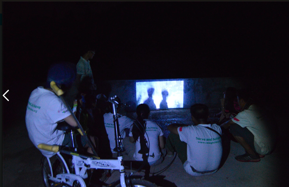 ALPHA刚开始,队员楚寒就倒霉地滑倒摔伤了腿,接下来的两周,她都不能跟着我们活动上工,特郁闷。她生日那天,我们的营养师副领队车车,居然用水果、面粉和彩虹糖,用简陋的大锅给楚寒做了个漂亮的生日蛋糕。能在远征期间过生日真是太幸运了,所有人都为她祝福。第二天晚上,谦哥用自行车驮着楚寒,我们走了好远好远的夜路,到水库边看星星。我们围坐在地上,一侧是水库,另一侧有一面白墙,一路拍了许多影像的队员老白用投影把几天来的记录投到墙上,给我们放起了“露天电影”。路遥背着学校里的吉他,在漫天繁星下为我们弹唱。