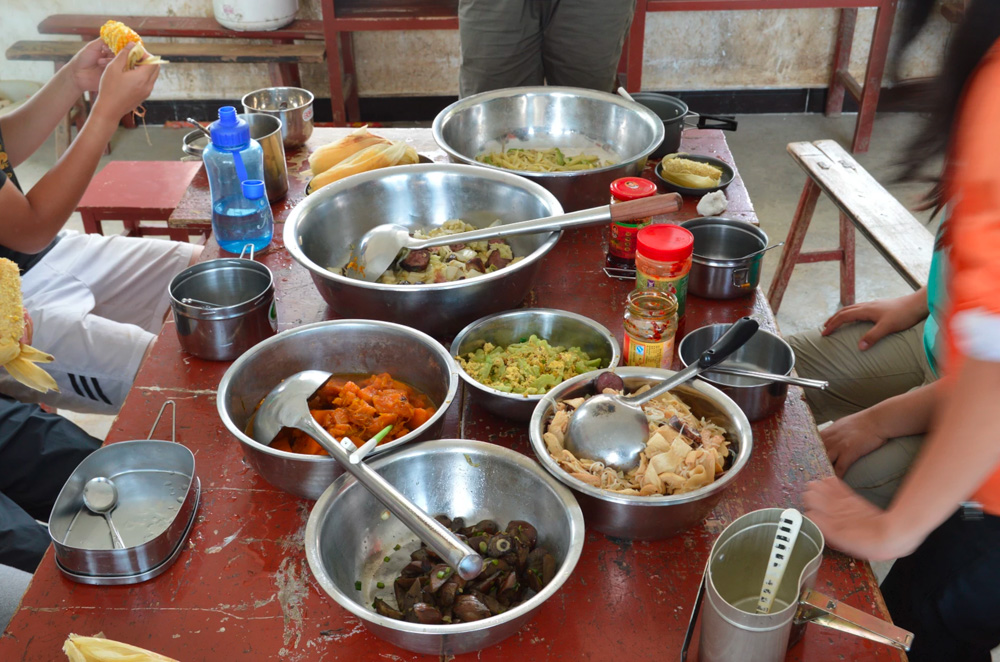 我们的聊天总是这么开始:第一问,“你是哪儿的人?”第二问,“你们那儿都吃什么?”接着就没完没了地说吃的。于是我们起了个特傻的队名——“黑白配吃货小分队”。“黑白配”指的是,我们用“黑白配”来分配角色。在一个队里,大家要轮流担任队长、营长、大厨、安全员的角色。队长组织全队,叫大家起床集合,照顾到每一个人。营长负责保管好全队物资。安全员顾名思义负责安全。大厨是个特别考验人的角色,一个人每天只有十块钱预算,每天的两个大厨要负责全队十几个人的伙食。我在这里开发了做饭潜能,当大厨那天正好是七夕,我们两个大厨做了七道菜。雷励吃饭有个“过三盆”的规矩,用餐前,餐具要过水,过洗洁精,过84消毒液。一队人来自天南海北,浙江的队员用白糖拌饭,广东的队员用酱油拌饭,我们湖南、川渝的用老干妈拌饭。