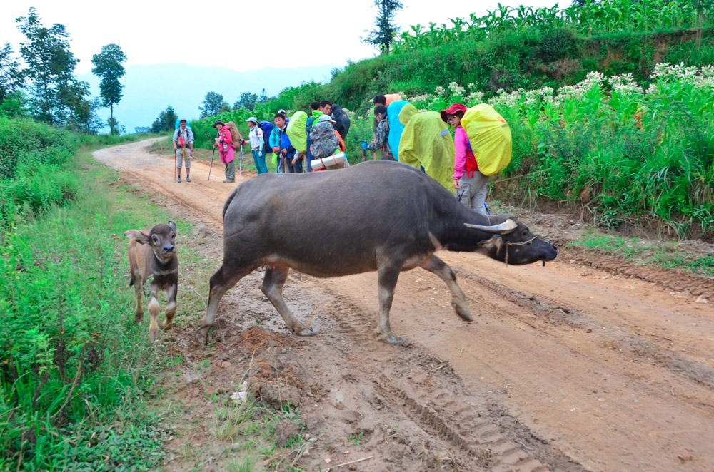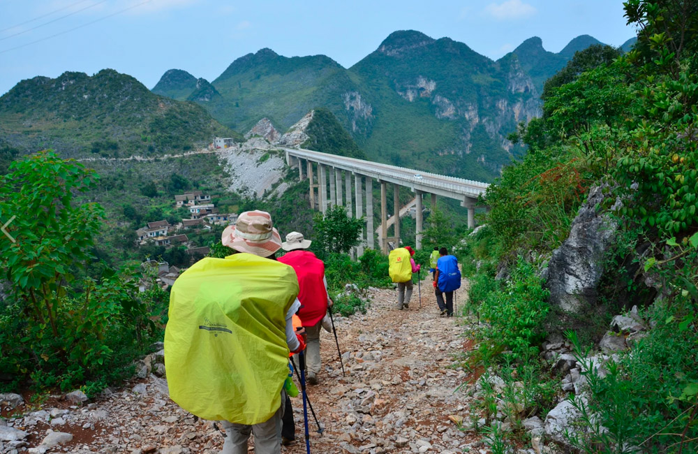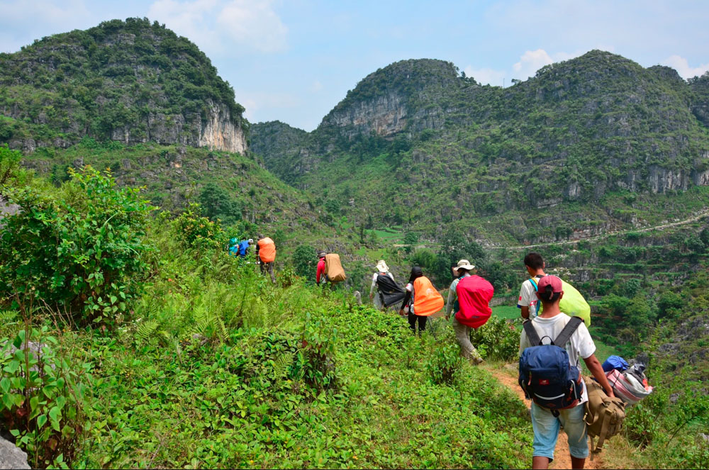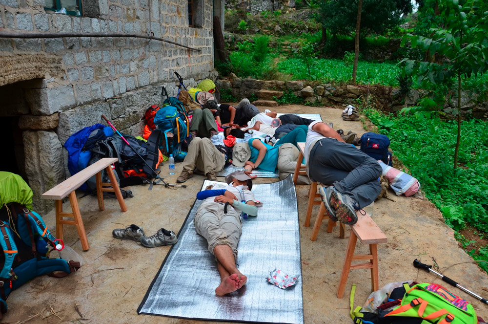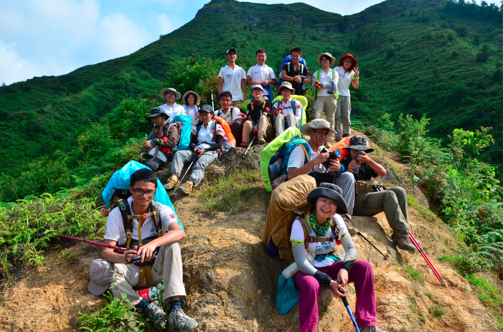 紧接着我们就开始了BRAVO最艰苦的徒步,整整七天,我们在贵州大山上爬行。支着登山杖,背上是三四十斤重的行李、干粮、食材、气罐等一大堆户外装备。清早出发,艰难地走走停停,直到傍晚。各队在徒步开始前都进行了采购,进了山就没那么容易找吃的了。有的队全都买零食,拆开就能吃;有的队买了一大堆士力架;还有个队聪明地买了火锅底料,既能涮菜,又能拌面拌饭。我们队买齐了所有锅碗瓢盆、菜刀和食物,第二天出发全忘在了大本营。