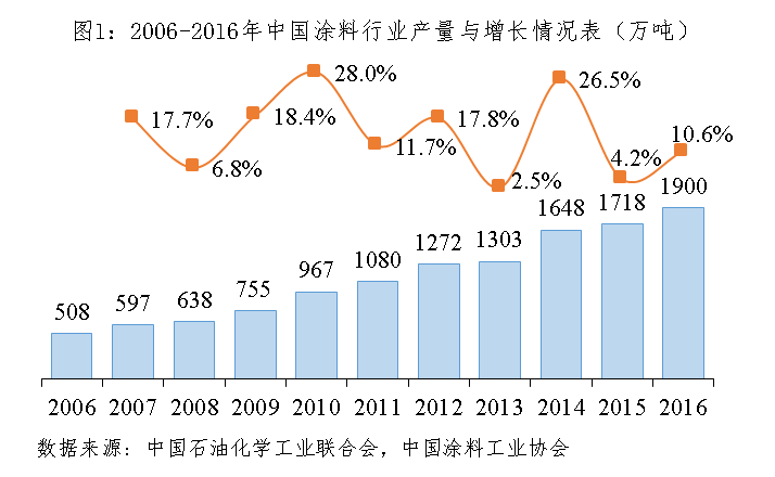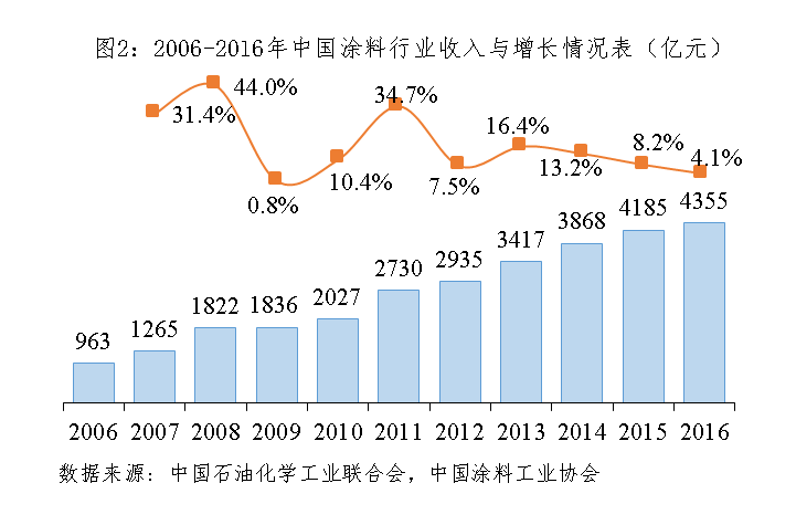 2017年2月16日,中国石油和化学工业联合会在中国石油和化工行业经济运行形势新闻发布会上发布《2016年石油和化工行业经济运行和2017年预测报告》。数据显示:2016年涂料行业全年规模以上工业企业产量达1899.78万吨,主营业务收入达4354.49亿元。纵观历史数据(图1,图2),从2006至2016年的11年间,中国涂料行业产量与销售收入始终保持增长,2016年均达到历史最高水平。而与此同时,增速则呈现波动下降趋势,其中,2016年行业收入增长率仅为4.1%,大大低于全年GDP 6.7%的整体增速。