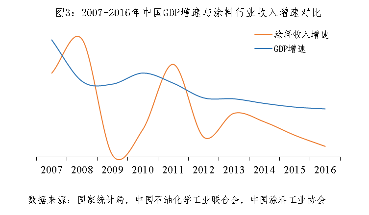 我们认为,影响涂料行业规模与增长的主要因素是宏观经济环境和行业统计口径,其中,前者为客观影响因素,而后者为主观影响因素。客观影响因素:宏观经济环境作为与基础设施建设、工业品制造等领域密切相关的配套产业,涂料制造业的兴衰与国民经济的发展息息相关。涂料下游应用领域涉及建筑、家具、汽车、机械、电子等众多行业,下游行业的发展状况直接影响涂料行业的经济运行情况。从增速对比来看(图3),涂料行业收入增速与GDP整体增速基本保持同一步调,但涂料行业收入增速明显波动更大。特别的,2013年后涂料收入增速的下降速度明显快于GPD增速的下降幅度。