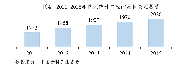 主观影响因素:行业统计口径由于统计数据来源于“纳入统计口径的”涂料生产企业,统计口径的变化也是涂料行业规模与增长变化的主要影响因素。随着行业协会影响力的提升,统计的覆盖范围也在逐步扩大,这使得统计口径不断放大(即“纳入统计口径的”企业数量逐年增加),从而对统计数据产生影响(图4)。