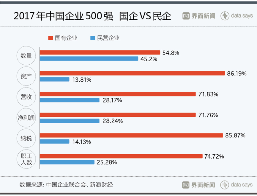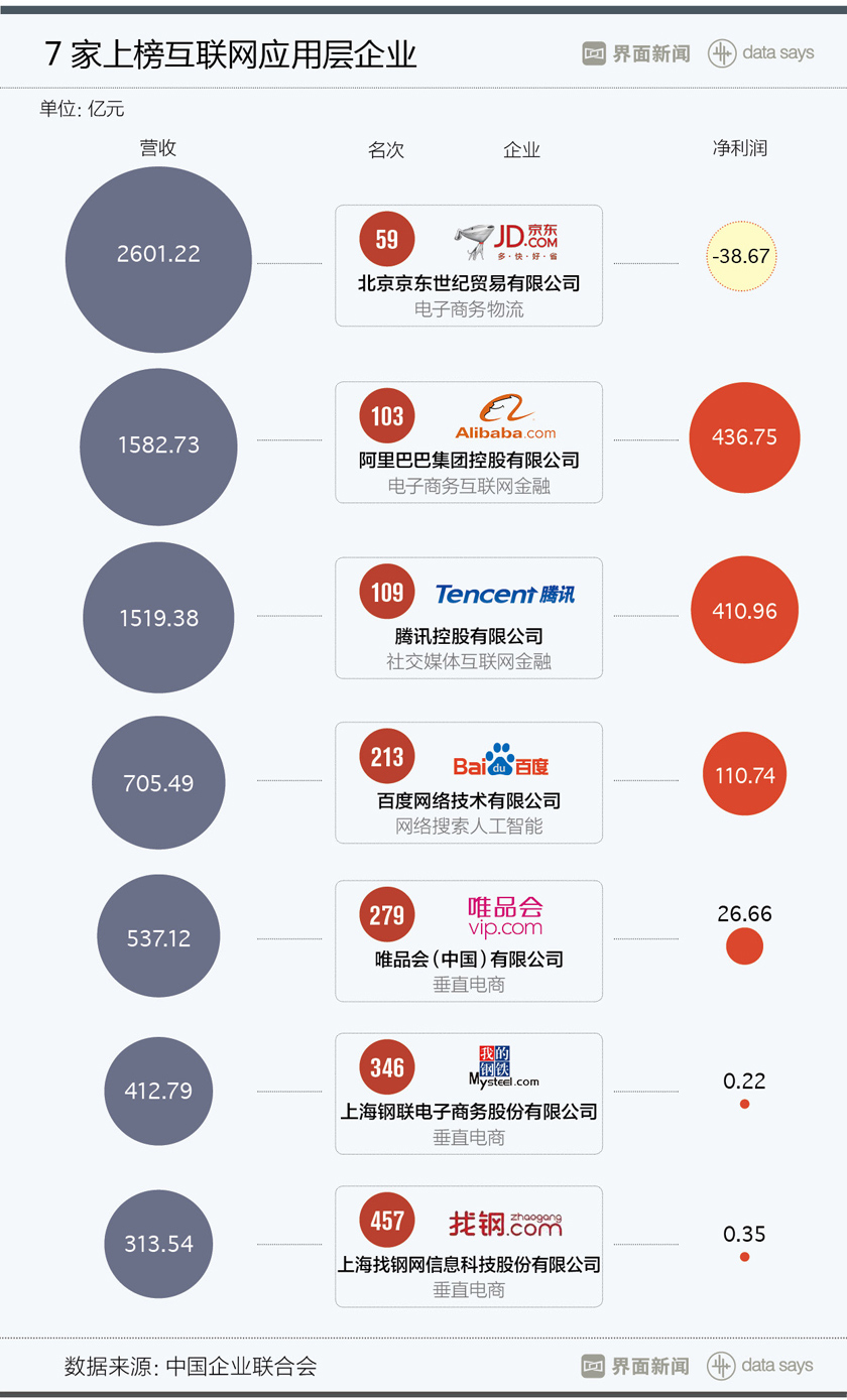 今年共有274家国企上榜,占比54.8%,这是榜单发布16年来国企数量占比首次低于60%。虽然上榜国企数量下降,但他们在营业收入、资产、净利润、纳税、职工人数等指标上仍占主导地位。在226家上榜民营企业中,华为以5215.74亿元的营收排名第17,是名次最高的民企。随着互联网经济的迅速发展,今年共有7家互联网应用层企业上榜,其中京东以2601.22亿元的营收排名第59,超越“BAT”。