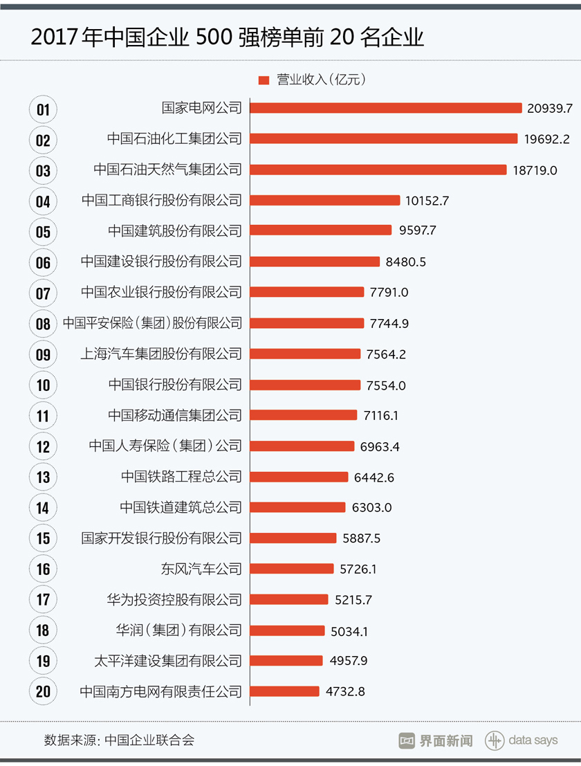 9月10日,中国企业联合会、中国企业家协会联合发布“2017年中国企业500强”排行榜。这份榜单根据企业的营业收入排名,已连续发布16年。今年该榜单的入围门槛为283.11亿元,较上年增长16.3%。国家电网公司、中国石油化工集团公司、中国石油天然气集团公司和中国工商银行的营收均在万亿元以上,分列榜单前四。