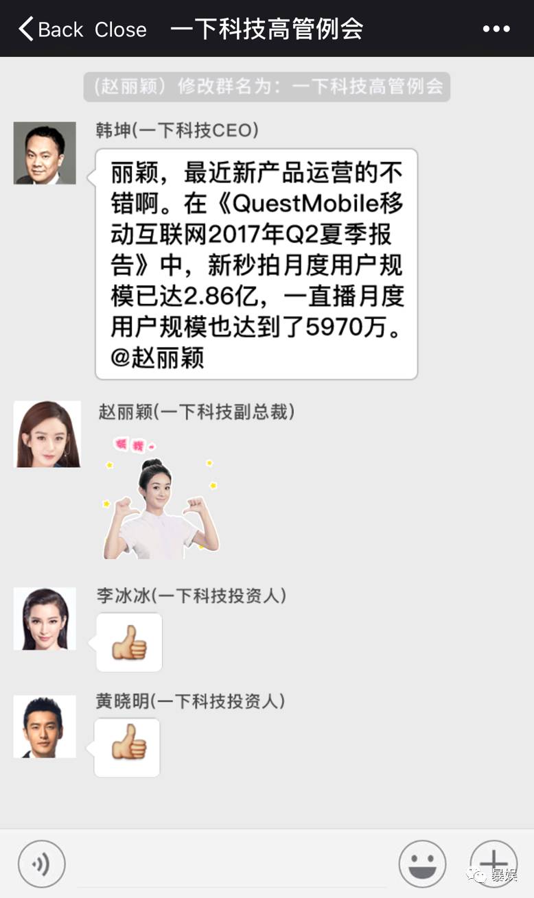 前不久在一个刷屏朋友圈的H5“明星高管怎么开例会”中,一下科技的明星高管理会便集结了贾乃亮、赵丽颖、黄晓明、李冰冰等众多大咖明星们。