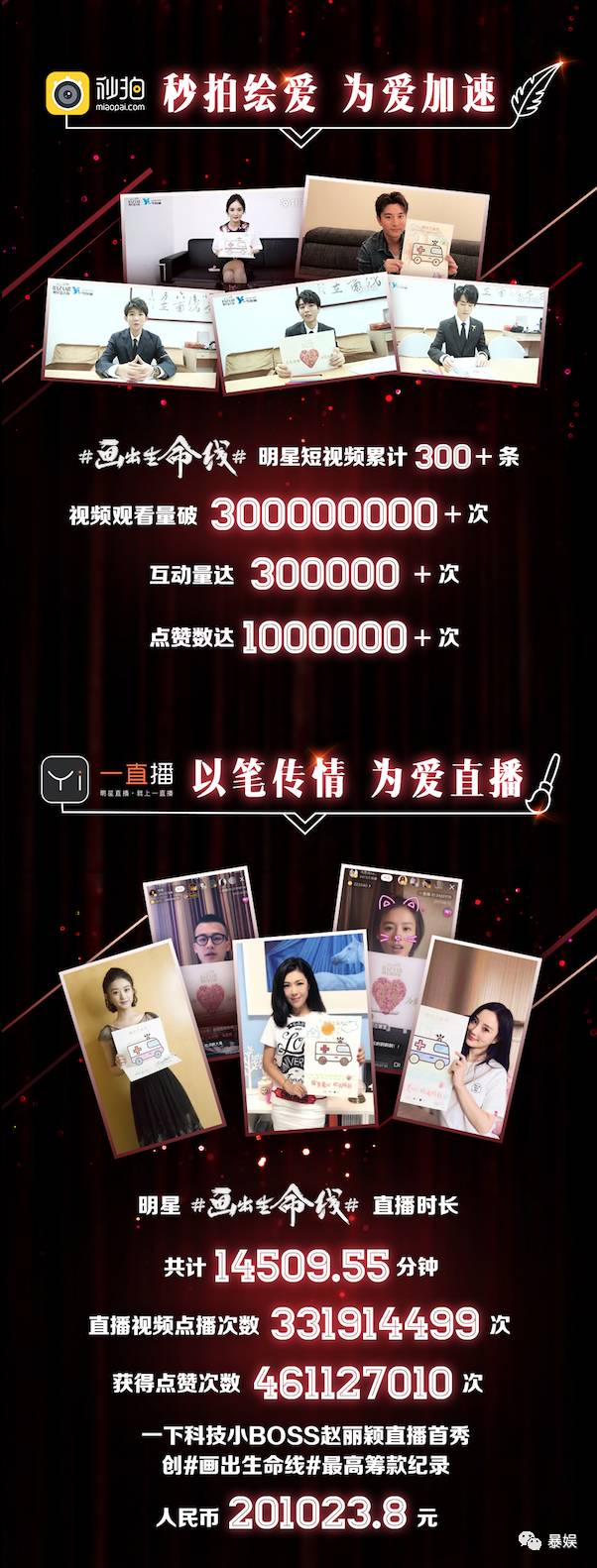 而今年从8月12日起历时29天,一共有409位明星参与,直播播出时长达14509.55分钟,秒拍发布明星视频300+条、播放3亿+,#画出生命线#微博话题阅读总量27.2亿,在秒拍、一直播上共获1525137.3元的善款。