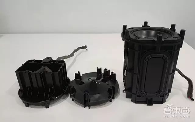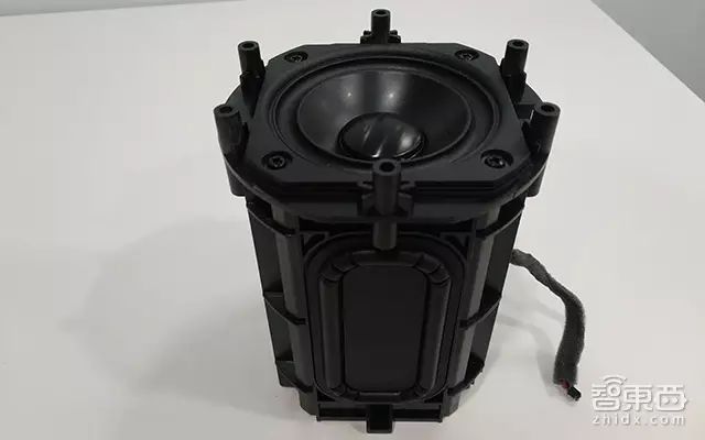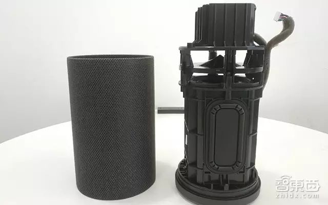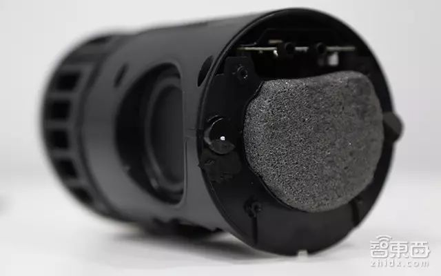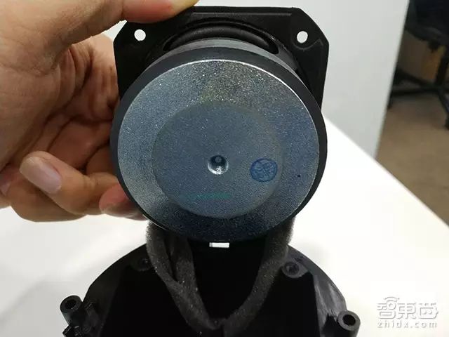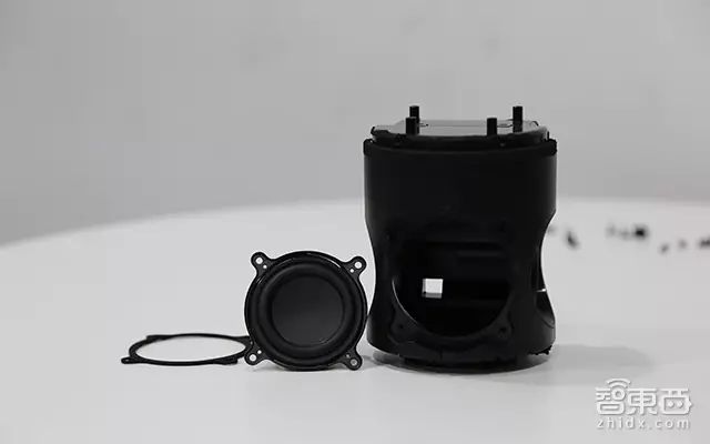 而剩下的就是问问音箱的发音单元了,下面是一个1寸高音单元,中间是一个反射锥,用来均匀扩散声音。而上面就是体积最庞大的一块音腔和低音单元。