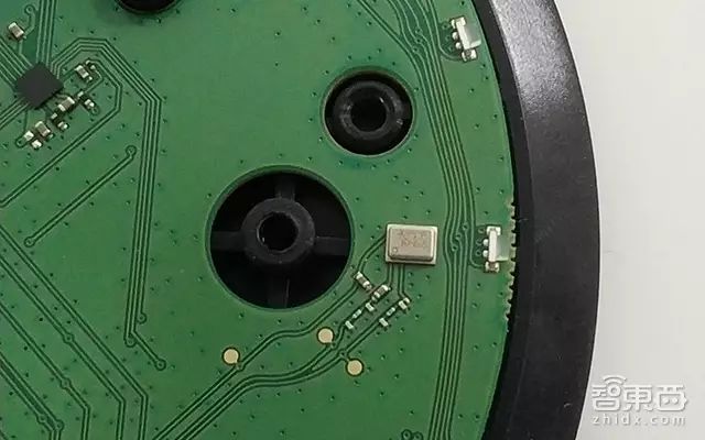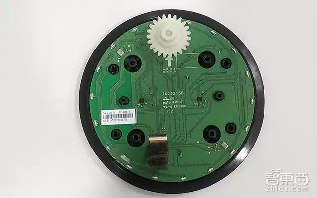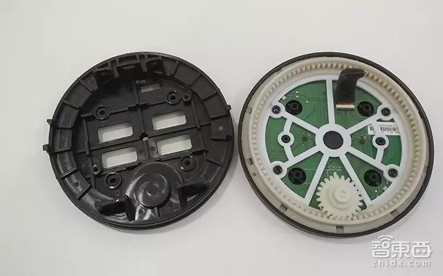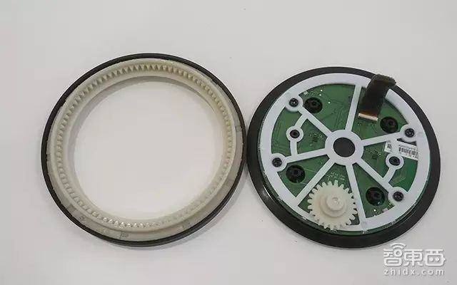 接着往下拆,移去顶端的黑色外壳,就可以看到问问音箱的齿轮结构和绿色的麦克风阵列板了。看到这个齿轮结构不禁联想到亚马逊Echo也有同样的结构。