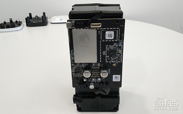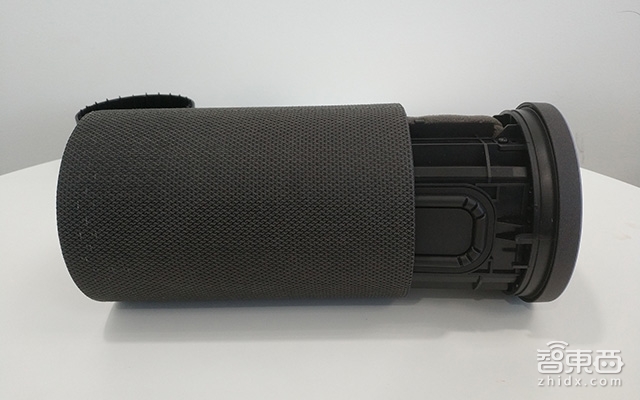 机身从上往下依次为麦克风阵列板(还被白色的外壳包裹)、正面的主板以及主板背后的音腔,再往下是发音单元和反射锥。而机身的侧面则是两个被动辐射器,它只有振膜而没有发声单元,用以增强扬声器的低音效果。