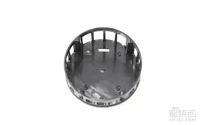 从底部看起,褪去叮咚2代的底座,底部灰色海绵包裹的是一块铁块,用以配重,从而减少机身震动。铁块两边还有两个圆形磁铁,通过吸附作用,固定底座。