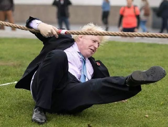 伦敦市长鲍里斯-约翰逊参加拔河比赛时不慎脚下打滑,一屁股摔倒在地